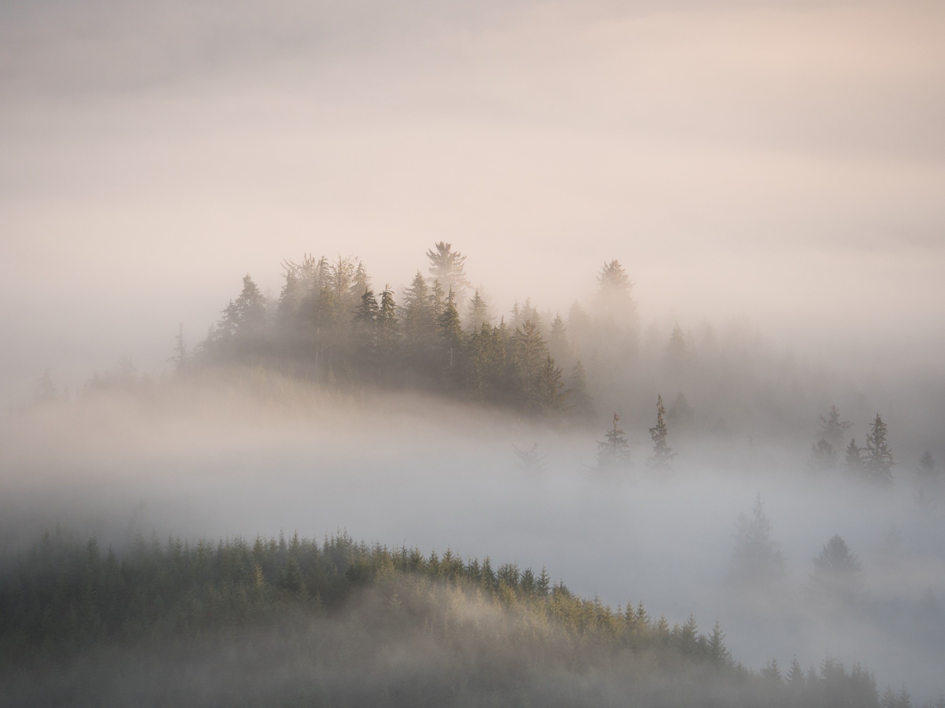 Just as I’m not sure this is my favorite from that morning, I’m also not sure I’m done finishing this photo. It looks good to me now. I see the feelings of being there. The clouds are shifting and inconstant. They are chilly, but as the sun rises the whole world warms. The trees on the island in the middle have matured since their last harvesting, while the dense trees in the foreground are much younger. Everything changes and shifts — including my skills and opinions on retouching. Maybe I’ll change this picture another day, but for now, the question I asked myself on the ridge-top has a pleasing answer.