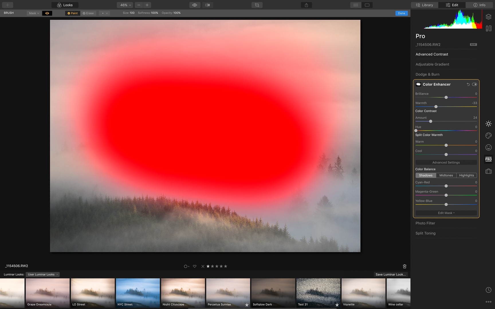 Next, I used the Pro pallet’s Advanced Contrast controls. These helped me show the detail in the clouds and in the trees. Punch and impact come from increasing the contrast, but these tools let you do it very precisely so that you don’t just end up with black trees on white clouds. They also set the stage for color adjustments.