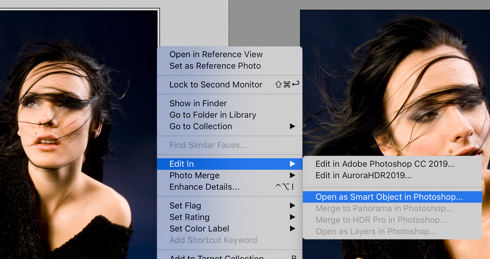 Lightroom Classic can hand off a file to Photoshop as a Smart Object by highlighting a photo then right click. Choose Edit In > Open as Smart Object in Photoshop.