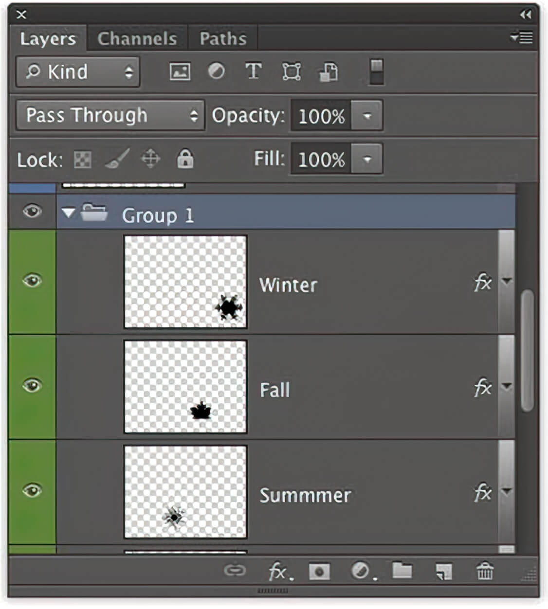 Sometimes you’ll want to permanently merge layers together to commit to a design. This can be useful to reduce file size or to improve compatibility when importing a layered Photoshop document (PSD) file into another application (such as Apple Final Cut Pro, Adobe Premiere Pro, or Adobe After Effects). This process is destructive (in that it permanently joins the layers, which limits future changes).
