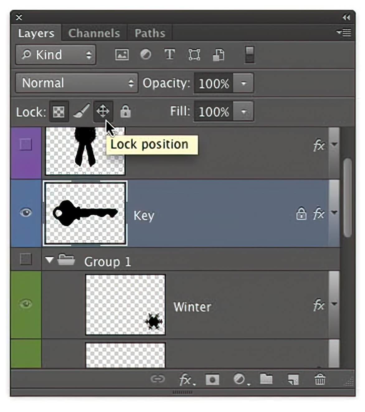 - Lock position: The arrow icon prevents you from accidentally moving a layer out of alignment or changing its position.