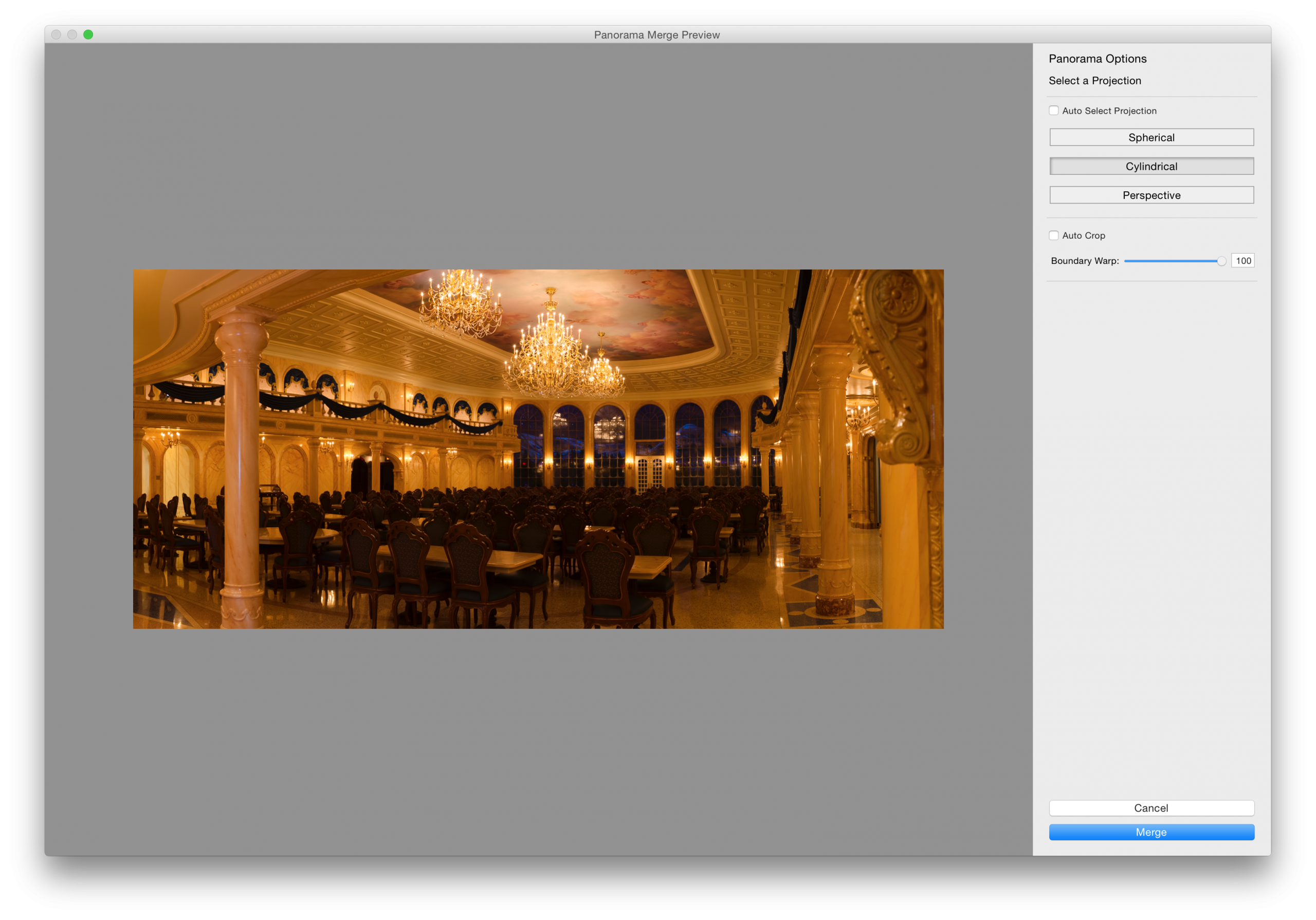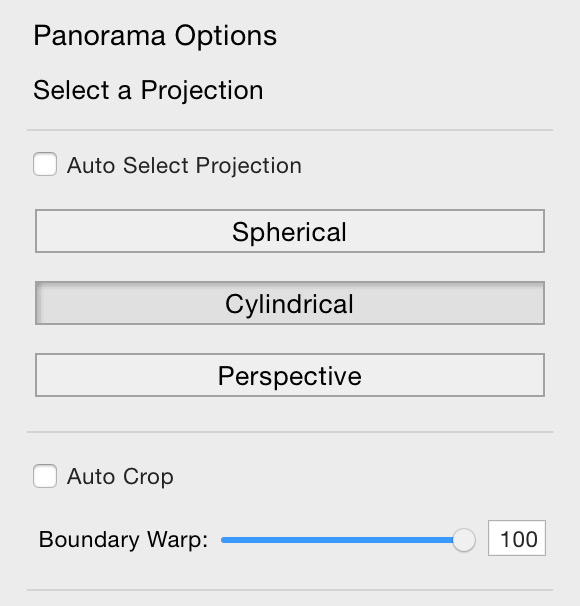 After you decide on your projection (Spherical, Cylindrical, or Perspective), you have the option to just merge the final image and crop it back in Lightroom or you can take advantage of the Auto Crop or new Boundary Warp feature.