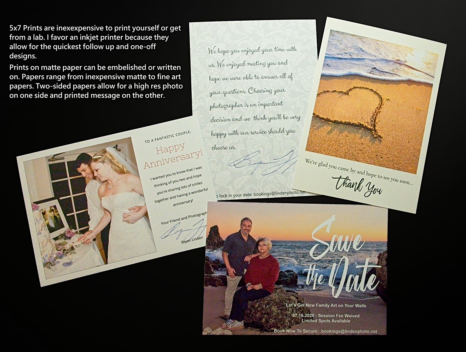 A 5×7″ with an inviting call to action is a great way to increase business while also spreading smiles. The easiest way to do this is with a desktop inkjet printer. This way you can do one-off designs with products like Canva, Promo and Desygner and create drop areas to quickly change out photos in your promo pieces. The inkjet printer you use for these marketing projects need not be top of the line and I personally often use a sub $150 all-in-one for this stuff and also for event work because I can have a beautiful print in under 30 seconds.