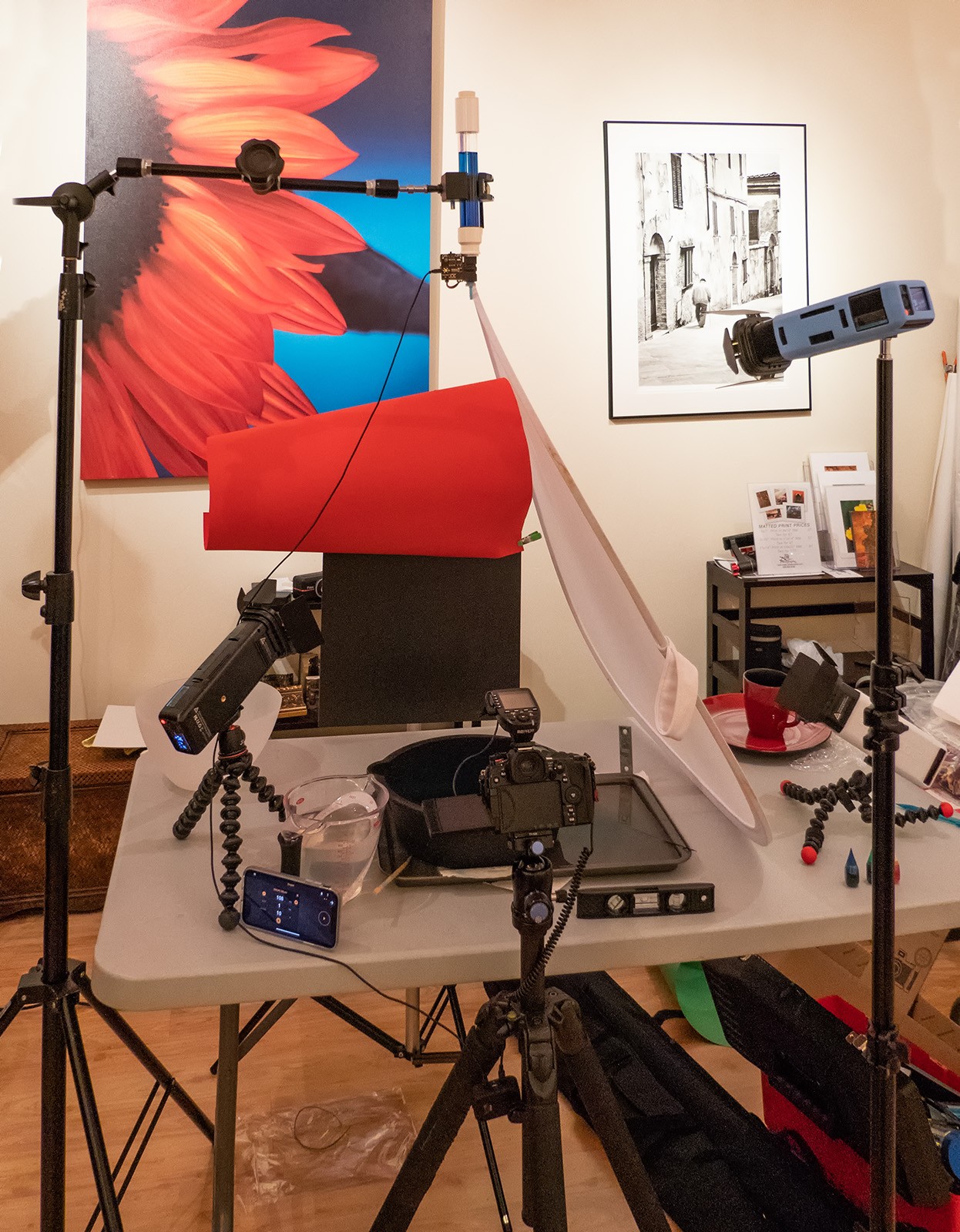 You need a camera that has a remote port and can be set in manual mode. I recommend a macro lens, but extension tubes can get you close to your splashes as well. I’m currently using a Lumix G9 with the Panasonic 45mm f/2.8 macro lens.