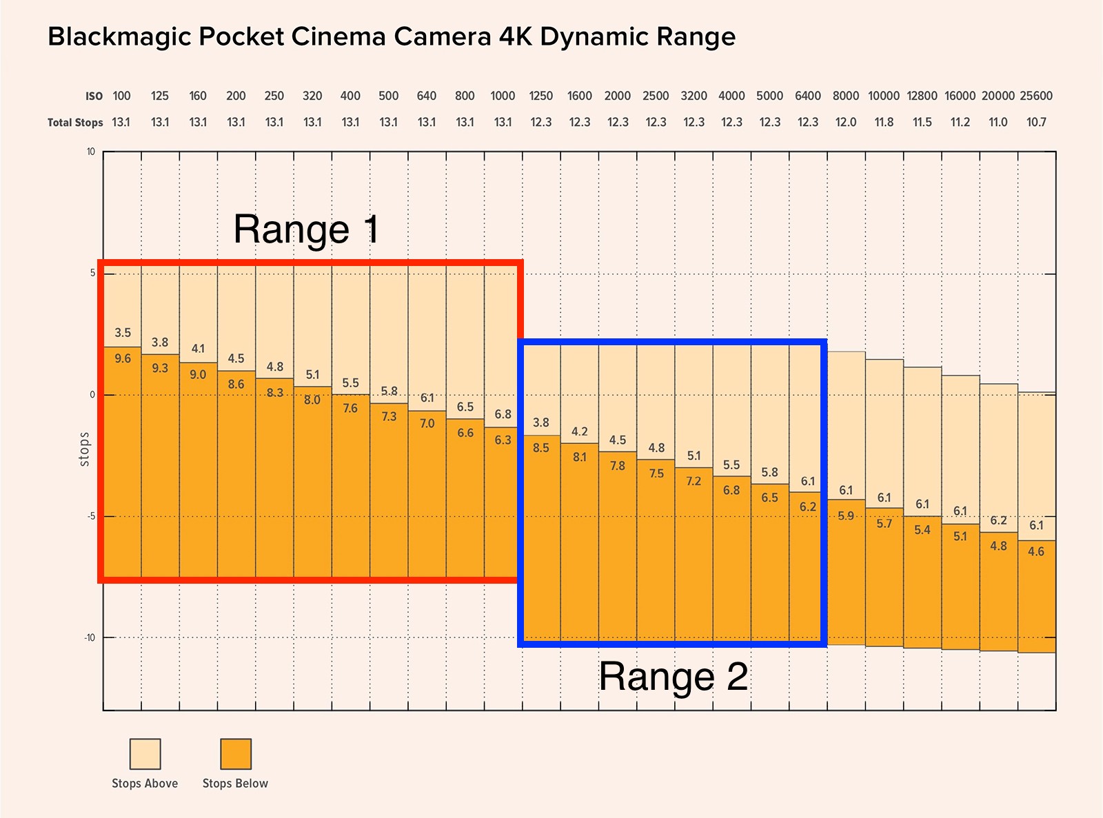 The BMPCC 4K has what is called dual ISO. What that means is that there are two separate ranges that we can use on the camera depending upon how bright or dark the subject we are recording. In some ways, it’s almost like having two different cameras because when we switch from one range of ISO to the other, the camera’s light handling capabilities change. In the chart below (from the BMPCC 4K User Manual), Range 1 is from ISO 100-1000 (see the red rectangle) and Range 2 is from ISO 1250-6400 (see the blue rectangle).