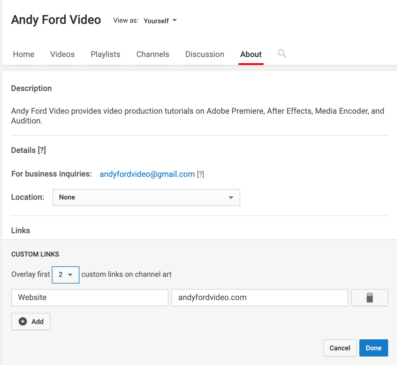 When you click the “Your Channel” or “Customize Channel” option, you will see menu headings running horizontally below your channel art. The “About” section is important to fill out. Be sure to add a description for your channel, including keywords that are relevant and helpful for your search rankings. This section is also where you can add a contact email. Be sure to add custom links, such as your website and social media channels. These will appear over the bottom right corner of your channel art image.