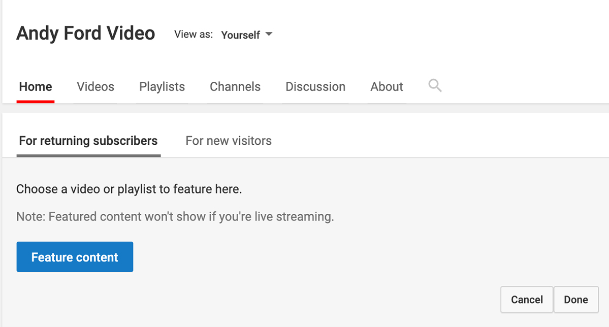 You can create a video, or trailer, for new visitors to your YouTube channel. This video is not shown to channel subscribers, so the goal is to create a short video to explain your channel and get newcomers to subscribe. You can also choose a video or playlist to play here for returning subscribers.